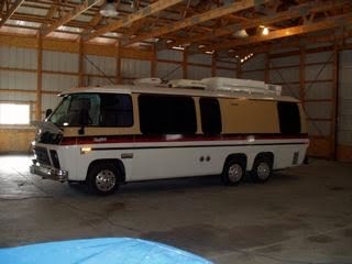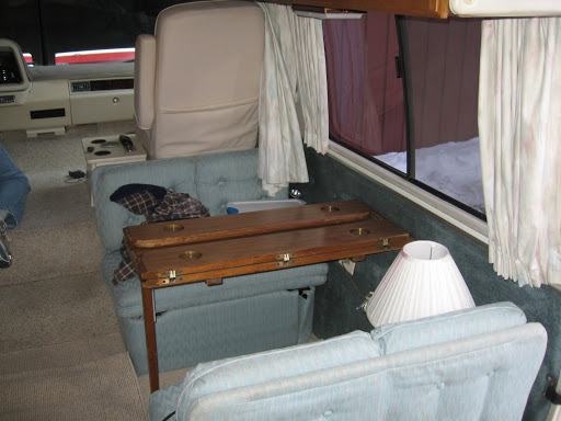 Then Jerry 1 and I peeled off. I drove this time. The accelerator pedal seemed very stiff, but it was easy to drive and the steering was very smooth. We got back to the barn for a thorough going over of other stuff. The interior is not perfect but it is really pretty good. The carpet seems like new and the little bathroom is amazingly clean and nice. The stove seems never to have been used. The built in vacuum whirred up to speed straight away and all the lights went on, as did the DVD player built ino the dash, hich connects to a drop down screen in the ceiling. The sink drainers are grotty, but can be easily changed and Tom’s bunk works well, though, again, the colour is not us. There is storage under all the seats but finding a place to put our millions of cereal boxes could be a problem… I could go on, and no doubt will, but perhaps not here. Suffice to say I handed over the check and will come back on March 10th to pick it up. Wow. We own an RV.