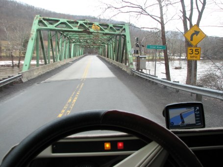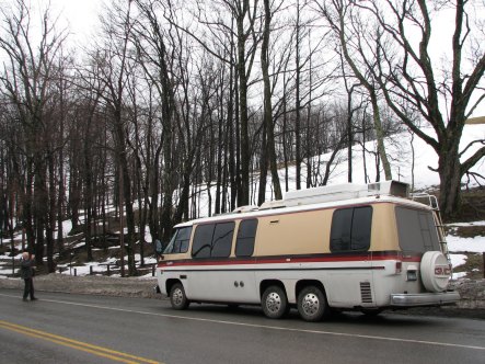 The road was damp but the sky was clearing as we eased back onto 250. It was still twisty but in somewhat better condition and we knew that at Belgium (Belgium, WV) we would turn left onto Route 50 which would take us the rest of the way. Somehow we never really noticed Belgium (seems unfair to make the obvious point there…) but 50 soon became a rollercoaster of a road, taking us deep into the mountains, hugging the sides of the valley, hairpinning up to the high ridges and then twisting back down the other side. There was quite a lot of snow, and we passed between banks almost as high as the GMC.