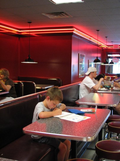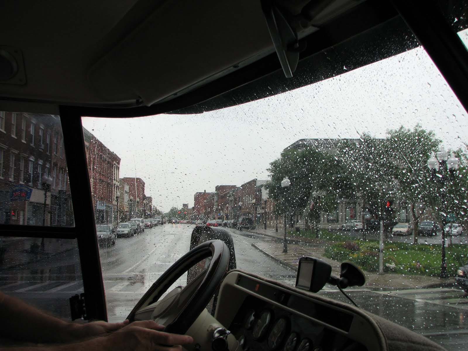 We ate in a down-home deli with a sandwich selection only slightly shorter than the bible. A well meaning team of teens was handling the orders and the young woman who took mine suddenly decided to go and work the till halfway through. Everyone else in the line got their food and went round me while our half-made sarnies sat on the side. Eventually I asked if someone else could perhaps finish making them, and when they were finished I got to the till where my original sandwich maestro was now working. I could see her suddenly remember me “Oh. Hi!” she said brightly and gave me a smile in recognition that we had once colluded in an order way back when. The food was good and worth the wait, but the rain was now falling heavily outside and we decided to press on.