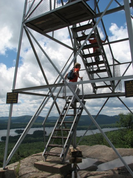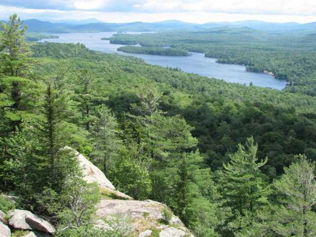 I threw on some clothes, hopped on the bike and went down to the ranger’s hut to book another night here, and then came back for a fry-up. Eggs, sausages, mushrooms and fried bread – coronary-inducing bliss! It was a cool morning with rain spitting around us and threatening to dampen proceedings but we fired up the magic bus and got back on the track towards Raquette Lake. It turned out to be a tiny little place with a church and a bar and an old steamship docked on the lake – well worth a poke about but not right now. We had an appointment with Bald Mountain and fifteen minutes later we were heading up a muddy track thick with exposed tree roots. Tom immediately ran ahead like the labrador he really is. It was an easy – and popular – walk; winding up through mature trees and scrambling over big smooth rocks. Sometimes we emerged onto the cliffside for a sweeping view over the wooded hills and long blue lakes with tiny houses sitting at the water’s edge.