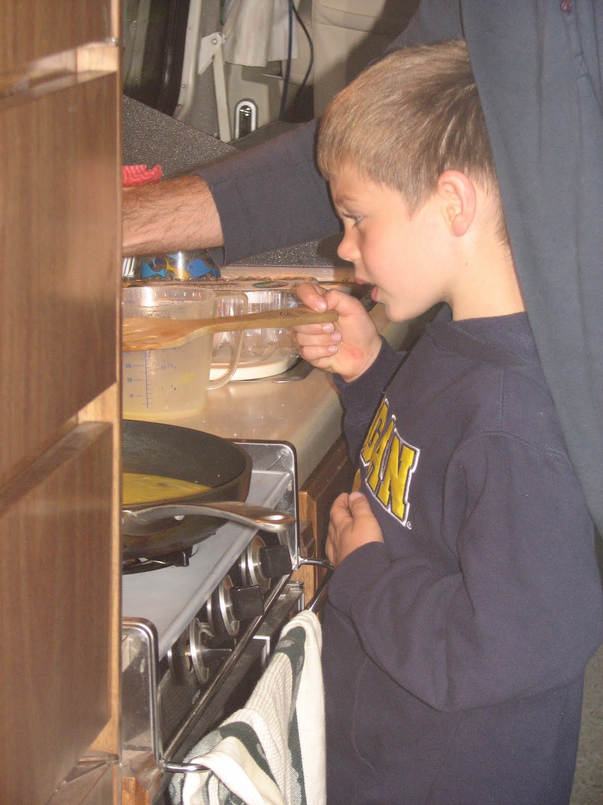 With the blinds down and a grey morning we all slept in after a terrific rainstorm overnight. Our little patch of Adirondak was completely sodden so Tom volunteered to make scrambled eggs.