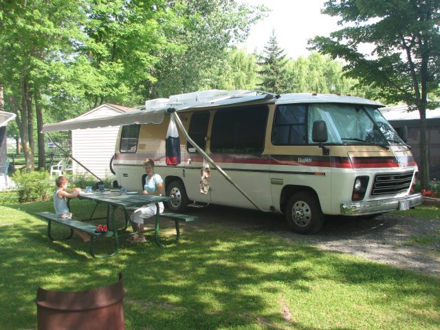 Everything changed when we entered Canada. The road was suddenly a bumpy little rural byway, picking its way through apple orchards, granaries and small farms with cottages. We passed a broad stone church with a village green in front of it planted with an avenue of trees. It was like being in Normandy. We cruised along, marvelling at the Frenchness of it all until we turned off to our little campsite, smack in the middle of nowhere. Both Philippa and I had talked confidently about relying on our school French in our dealings with the natives, who everyone has told us will not speak English. From the machine-gun delivery of the girl who checked us in, one thing became quite clear to me. Unless our conversations with local people consist entirely of remarks about Monsieur Tremblant dans la jardin/chambre/cuisine, I am going to be somewhat out of mon depth. Philippa though speaks far more French than she is willing to let on and my accent isn’t bad, so we shall survive.
