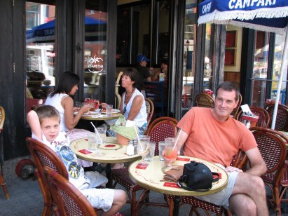 At Trois Rivieres we stopped for lunch. This is a port town with vast silos and cranes on the riverbank. An ancient black-hulled container ship was docked and either loading or unloading. The road into town goes almost into the port, before clinging to the river bank and finally entering a handsome downtown lined with little cafes which the which the Michelin described as “reminiscent of Paris”. That was pushing it perhaps, but we found one for lunch and sat outside in the shade. Once again we had a lovely waitress – a lady slightly older than us – who was all smiles and played along with our French and flirted with Tom.
