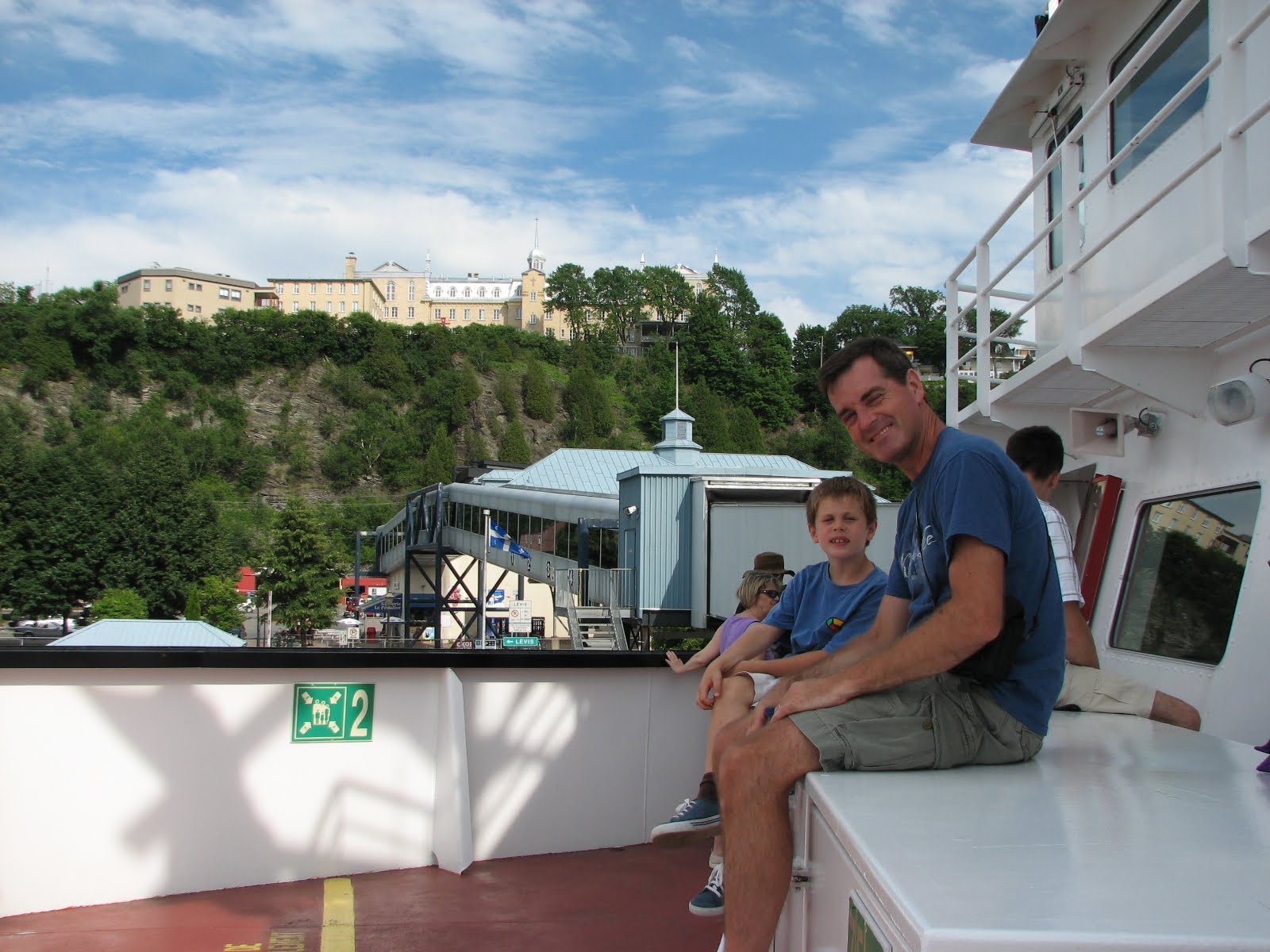 We caught the ferry back feeling a bit too hot but with a cool breeze across the water. We rode Quebec’s little funicular up the the upper part of the city. A funicular is what you get when you cross a train with an elevator I think. At the top there was a street performer doing a series of bike tricks and some nice gags with hapless members of the audience – he noticed a bald man was leaving and threw him a terrible woollen wig; “you forgot this!”. Further along there were others of the “sprayed to look like a statue” variety and Tom was fascinated. A girl in a wonderful bronze costume beckoned him over to look in her donations box and when he did, the box squirted him. He shrieked, completely delighted.