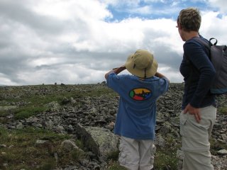 We had our sandwiches on the summit looking across the velvety green Chic-Choc mountains and watching serious looking big grey clouds sweep over us. It stayed bright though and the wind had dropped to a refreshing breeze.
