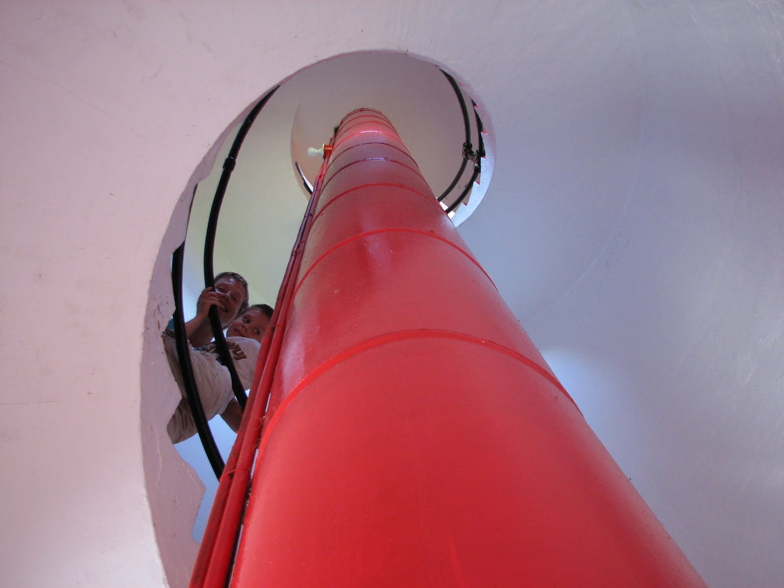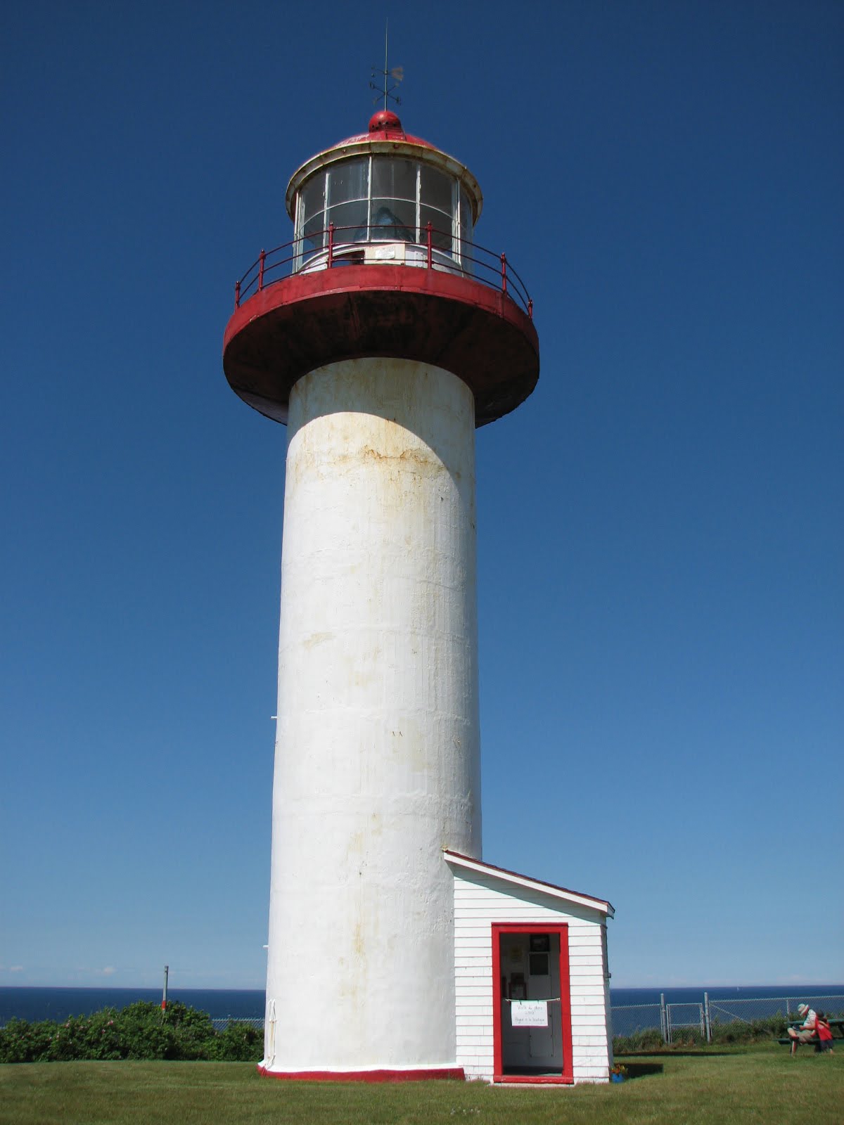 We pulled off the road to climb a lighthouse and emerged wobbly-kneed onto its outside platform with a skinny guard-rail and a bullying wind. Tom was all for running around it but we were all for going back in. There was also a little museum which a smiling teenager opened for us. At the back it had two vast compressed air tanks and the engines that filled them. The lad said they were for the “fog ‘orns” They had to be monitored day and night when the fog closed in so two lighthouse keepers had to be stationed there. There is a little automatic light now and the days of the lighthouse keeper are over.