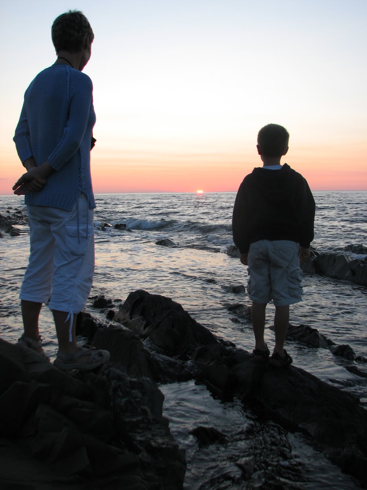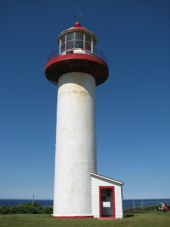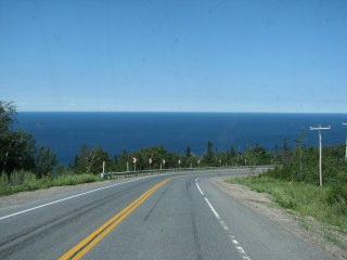 The road along the northern tip of the Gaspe hugs the shoreline and passes through occasional villages, which are no more than a few houses strung along the roadside. In one we stopped at an internet cafe to look for a laundromat (failed) and update the blogs (succeeded) and see if there are any more Jack Stalwart books in the series because there really must be I have read them all but I think he goes to Egypt but I’m not sure, but can we see if there are any (yes Tom, there are). The “cafe” felt like half of someone’s kitchen, which is probably what it was. It had three computers and an actual kitchen at the back. It was manned by a lad with long ginger hair dressed in black who practiced long, prog-rock guitar riffs on his (unlplugged) Fender while we tapped away. He leapt up to get us coffee though and it was a useful hour.