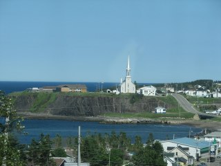 Onwards again toward the park at Forillon where we will be tomorrow. The lady in Mont St Pierre had suggested the campsite at Grand Vallee was nice and as we crested a hill and looked down into the town, with its crisp white church, epiceries and poissonerie, it seemed like a good place to stop. We bought more lobster, crab cakes and shrimp at the immaculate little fish shop, though I passed on the shrimp sausages. We loaded up at the grocery, cleaned up the marmalade explosion and drove on a couple of K to the campsite which slopes down to a rocky beach. It also had a laundromat so Philippa hauled our reeking bag over to it and came back some time later with clothes that we can wear without offending the animals. Supper was lobster and corn on the cob outside in late afternoon sunshine and a busy breeze.