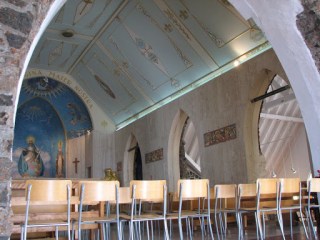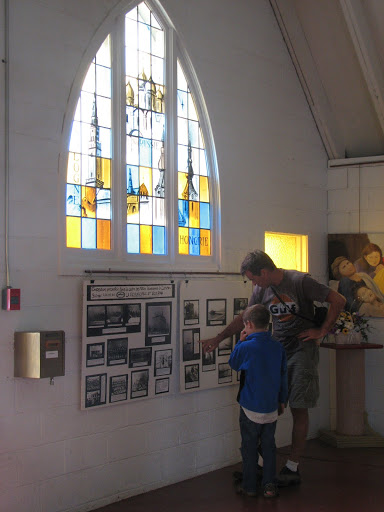Originally it was a small stone church, built in 1935 with rocks carried up by the people of Carleton-sur-mer as an act of devotion. Later on a new bigger roof was added to protect the original chapel and add some more space. It was lovely inside; very simple but with modern stained glass windows in soft colours which picked out other houses of worship including Ely cathedral – “the ship of the fens” – near my old stamping ground in Cambridge.