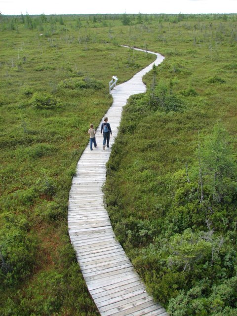 First stop, the bog. And quite a bog it is, rising in the middle to over six meters and gradually eating away at the forest around it. A grey wooden boardwalk runs across it through green and red mosses, blueberry bushes, orchids and carnivorous pitcher plants. They eat insects of course but I always half hope to see a moose leg or something sticking out of one. We saw moose prints and that was as close to widlife as we got, but that wasn’t the point really. The bog had an other-worldly feel to it like a single giant organism sitting quietly in the midst of coast and forest.
