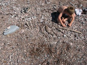 The young lad came down to point out a Bald Eagle sitting regally on a dead branch with shoulders like a fifties suit. Such a big solid bird with its white head and thick yellow beak. When it flew off, it simply extended its big wings and flapped once, then soared around the headland. Later we watched birds we thought were kingfishers flitting along the cliffs. One had a silver flash of fish in its mouth. The pebbles were hot from the sun and I lay back and dozed while Philippa swam and Tom discovered a real actual dinosaur skeleton. It was a rare and beautiful place. Higher up on the grassy slope of the headland there were big piles of stones which must have been something to do with the original settlement. It would have been a peaceful place to live that’s for sure.