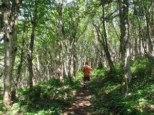 We began in a high meadow with tall grasses almost obscuring the narrow track and as we worked our way down into the valley the white barked birches grew more dense, as did the bleached skeletons of long dead spruce and fir trees. Thick brush lay all arond, a tangle of rotting tree limbs and ferns. The trail was steep and rocky – boggy in places – cutting along the side of a steep sided valley and narrow enough to feel like a goat track in places. A river the colour of tea crashed about in the bottom. There were piles of moose dung all over the place and we disturbed some little brown snakes which shot out of our way and then sat still on the slope hoping not to have been seen. The sun was hot but dappled through the trees and a cool breeze made twigs creak and grasses swish.