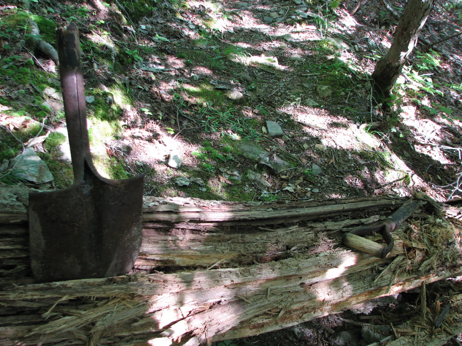 The walk back was hard work but felt quicker somehow. On a new route, your brain is always wondering whether you are nearly there and what’s round the corner. On the way back it seems to just relax and let you get there, ticking off the big rock with the moss or that dead tree as you pass. There was one strange thing though. At one point we came across a long dead tree which had split and fallen across the path and which hadn’t been there on the way down. Embedded in it was a rusty old spade and lying on the trunk, the broken spade handle. It too was rusted and pitted iron, with an ancient weather-worn wooden handle. It almost looked as if the tree had fallen with the spade stuck in it, snapping the handle off as it did so. It was a very strange sight and we couldn’t work it out.