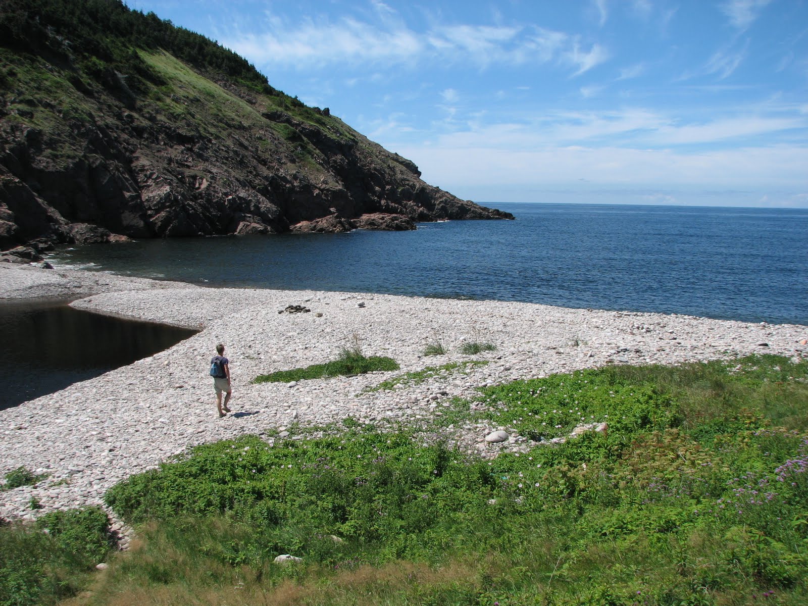 Walking on the empty beach this morning under a blue sky, feeling the warm round pebbles under our feet and watching the waves pick themselves up and flop onto the shore, we decided to stay another night here. I mean really this is as good as it gets so why rush off. We packed up and saw an empty space backing onto the sea so I wandered over with a lawn chair to reserve it, just as a couple on a Harley pulled in to it. Rats. I really wanted to look over the sea but it turned out they had stopped for coffee and were only too happy to let us move over. Philippa dropped the money for the space into the slot and we set off for another hike.