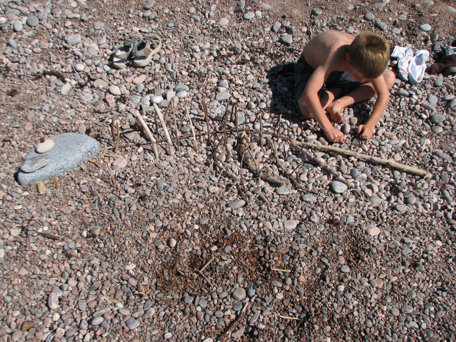 The young lad came down to point out a Bald Eagle sitting regally on a dead branch with shoulders like a fifties suit. Such a big solid bird with its white head and thick yellow beak. When it flew off, it simply extended its big wings and flapped once, then soared around the headland. Later we watched birds we thought were kingfishers flitting along the cliffs. One had a silver flash of fish in its mouth. The pebbles were hot from the sun and I lay back and dozed while Philippa swam and Tom discovered a real actual dinosaur skeleton. It was a rare and beautiful place. Higher up on the grassy slope of the headland there were big piles of stones which must have been something to do with the original settlement. It would have been a peaceful place to live that’s for sure.