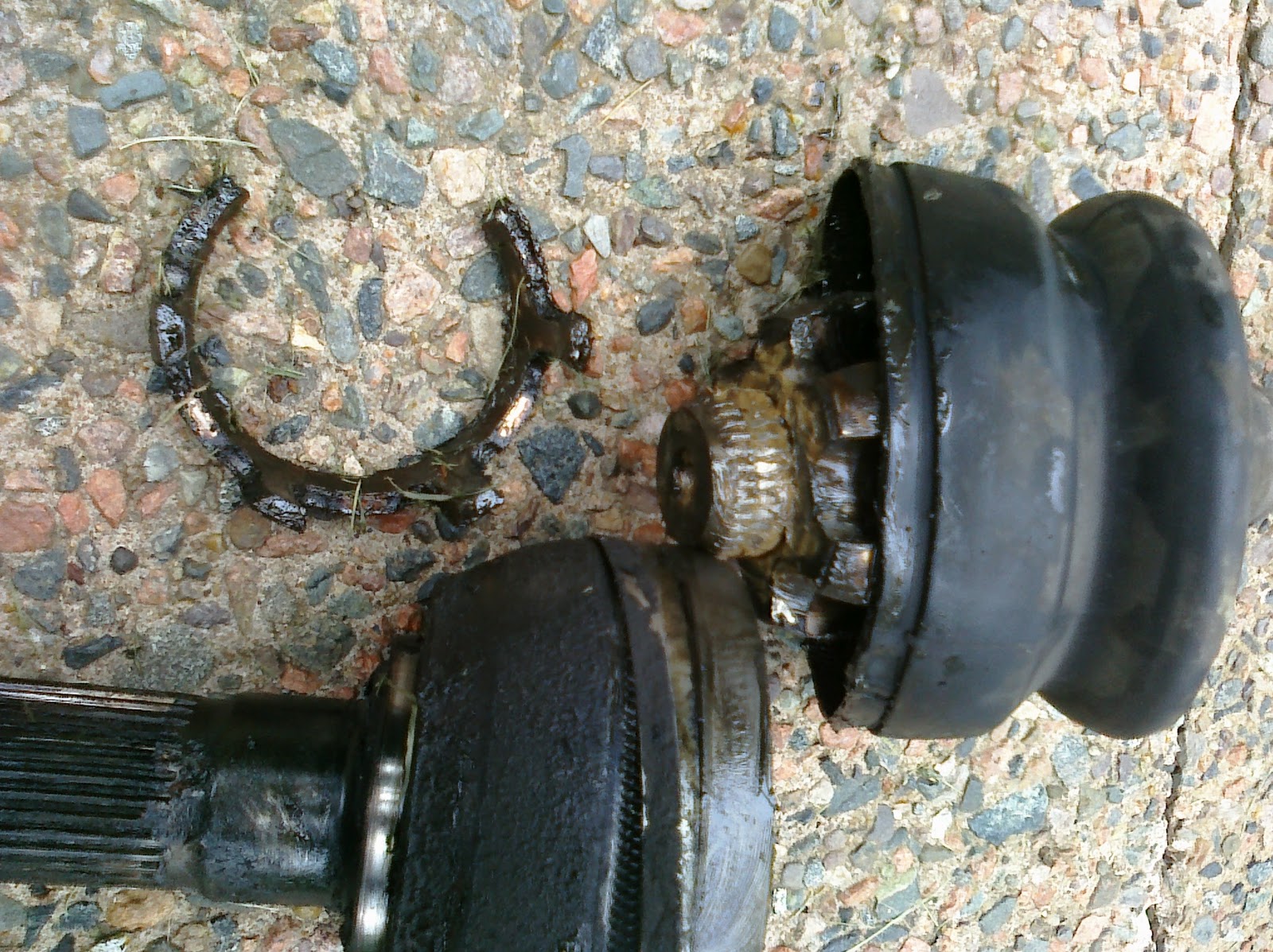 This was the problem that caused us to rethink our travel plans. That little crescent on the top left, should actually be a ring, but Harvey ate the other bit and so all the ball bearings that fit in the spaces in the lump of metal on the right, fell out. Stop me if I’m getting too technical here. That rubber boot on the right which fits around the whole thing had a split in it on the other axle, which was letting the grease out and when we took it apart the cv joint was showing signs of wear, so Paul constructed a new joint and I fitted it this morning. So now both axles should be good to go. Any questions? Good. Test on Friday.
