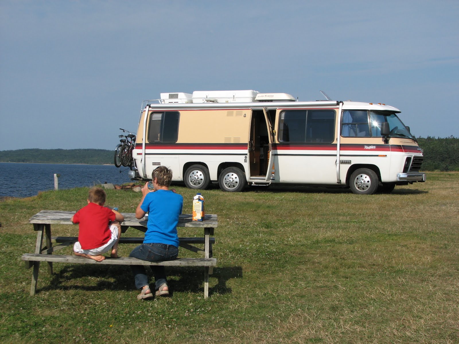 Fifteen minutes further north is Parker’s Cove and a terraced grassy campground looking over the Bay of Fundy and a (slightly) heated pool. It is apparently the only four star campground in Nova Scotia and is rather pleased with itself, to the extent that it is unnecessarily expensive. So we all had a go in the pool, despite the grey skies hovering overhead threatening rain. It hasn’t fallen yet and hopefully it won’t tomorrow, when we have a surprise treat for Tom. Not far from here is an old fashioned amusement park where we plan to have some old-fashioned amusement.