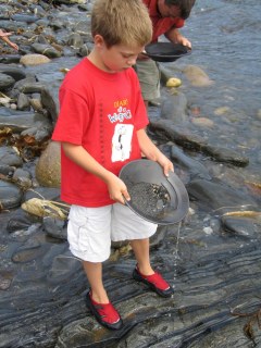 The Ovens, you may recall, had a bit of a gold rush in the 19th century and you can still pan for gold on the beach today. We loaded up the mule with salt beef and whiskey, and went out to strike our claim in Lister gulch, with the aid of some pans that we rented from the nice girl in the shop. She told us that one chap is a regular and has made more than $3000 from the gold he’s found on the beach. Someone else found enough gold to make himself a wedding ring. So Tom was convinced that a mere thousand dollars worth of gold was a pretty reasonable target, and was somewhat indignant when walnut sized nuggets weren’t tumbling from his pan at first dip. But fairly quickly we did strike paydirt with literally several pieces of iron pyrites which took no more than an hour to swill out from the beach. But also, glittering in the bottom of my pan were the tiniest flecks of real gold. Philippa insisted that we put them in a little bottle and take them with us which we did, though they were so small we couldn’t separate them from the rest of the gunk, so I’m not giving up the day job.
