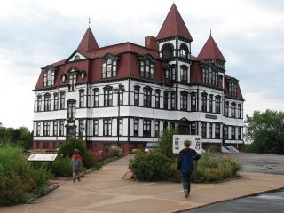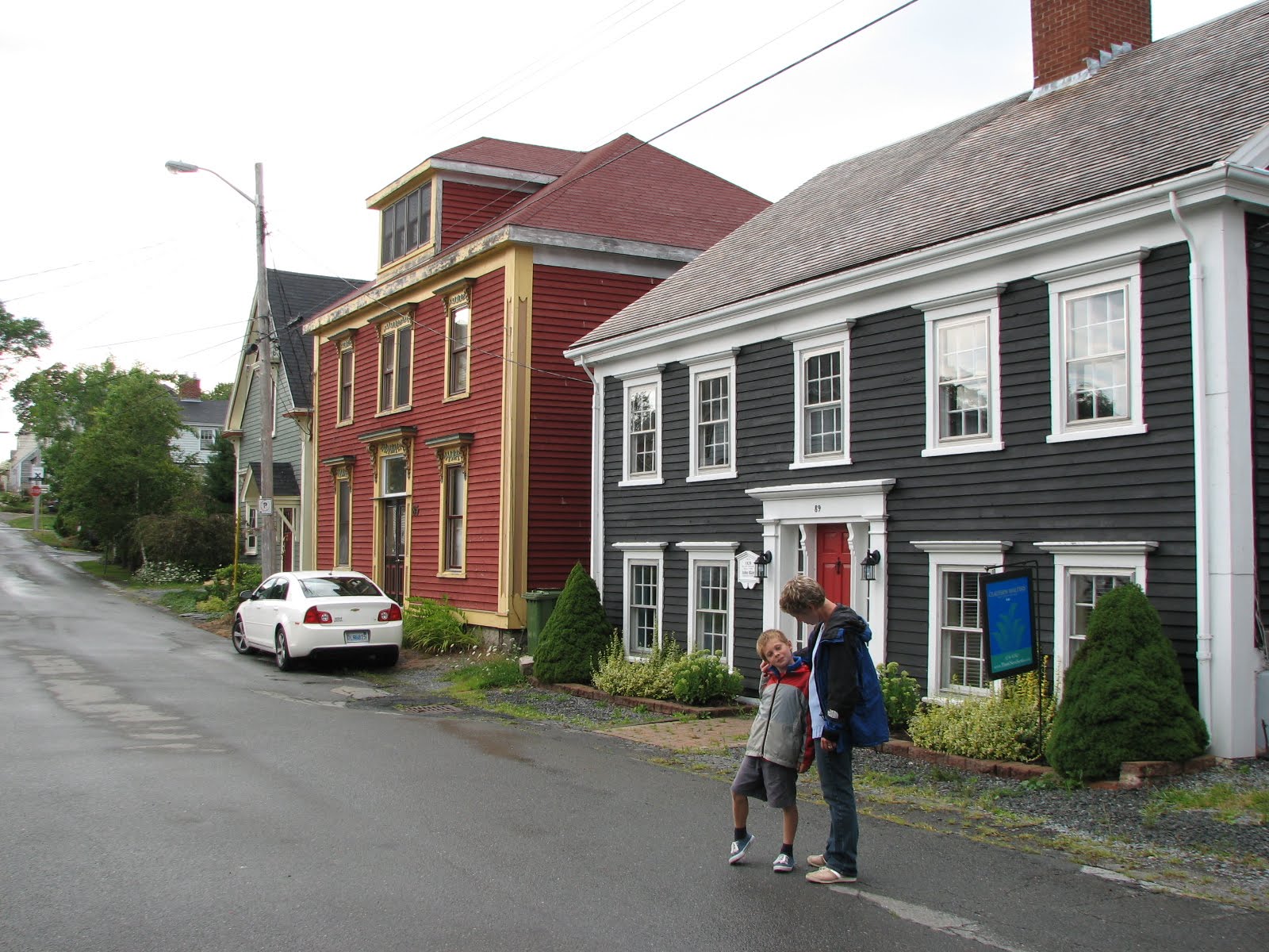 And so to Lunenburg which is set out on a grid system as per an eighteenth century British survey. The surveyor though was clearly oblivious to the fact that he was surveying a steep hillside, so the town feels a bit like San Fransisco with steep streets levelling off sharply at intersections before plunging downwards again. Its a little time-warp of a place where ninety percent of the buildings are wood and most are at least a hundred and fifty years old. They have ornate carvings in the eaves and around the windows and the details are picked out in different colours. It was settled by protestant colonists from Germany, Switzerland and France in the 1750s and has a bit of a Bavarian feel to it – particularly with the white clapboard churches which seemed to be on just about every block. Its not completely twee though. Plastic lawn chairs, barbeques and kid’s bikes scattered in back gardens remind you that these are real homes too. But those kids go to the most amazing looking school. It was built in the mid 19th century by far-sighted planners who thought that children should have plenty of fresh air and sunlight, so they built the school on top of a hill and gave it big windows and its still in use today.