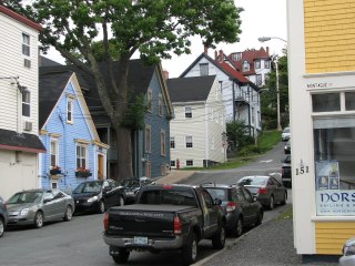 My favourite exhibit was a nineteenth century fishing boat, with all the original narrow bunks and other fittings – and menus. It seemed that the fishermen got all the stuff that they would otherwise throw away: fish head soup. fish cheek stew and so on. They had a ten year old cabin boy to help cook for a crew of 14. We relied on a rather good restaurant instead (Grand Bankers Seafood), with a view of the harbour. When we got back up the hill to the carpark there was a little business card tucked into Harvey’s door with a picture of a stretch GMC on one side and a note from Nancy and her friends the Holloways from Georgia on the other. They were in town too – sorry to miss you folks!