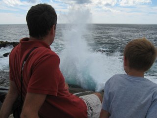 What really makes Peggy’s Cove is the shoreline. It is a dramatic sweep of low smooth rock pounded by thunderous blue-green waves throwing up plumes of foaming spray. We watched transfixed as the breakers rolled in and smashed into the shoreline. Cormorants dived into the waves almost as they broke. Tom loved racing over the rock and despite we tourist hordes Peggy’s Cove is rather special.