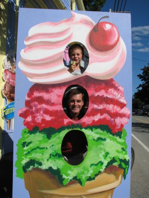 Back on the road and Tom curled up and went to sleep on the sofa as P and I enjoyed the view. He woke up in Mahone Bay with its three churches in a line, each trying to edge the other ones into the bay it seemed. There was ice-cream, there was shopping, there was posing for pictures through a cutout of giant ice-creams and then there was a final ride to our campsite across the bay from Lunenburg. Its a great spot where you can pan for gold on the beach and see the caves, or “ovens” as they were known here. Its so nice in fact that we will stay here tomorrow too. Harv, its good to have you back.
