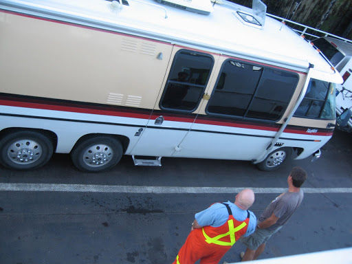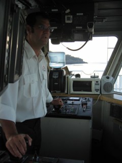 When we drove on again the same deckhand guided us on and asked all about Harv. “Now that is a nice rig. I don’t like the new stuff, but yours has lines“. We had a long chat with him and showed him around. He left us for a bit and came back to say we should go up onto the bridge and meet the captain.