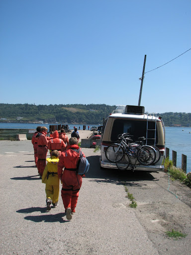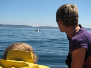 Our whale watching appointment was at the ferry landing on the other side. We zipped up into big orange survival suits, which our guide said were to really ensure that they could find the bodies, as the water was cold enough that you only had a fifty fifty chance of lasting more than fifteen minutes in the water. It looked nice though, flat and mellow in the sunshine.