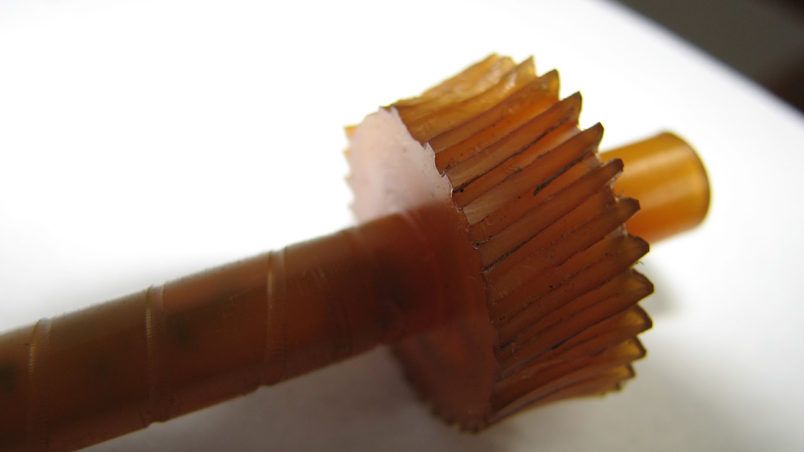 Its the plastic speedo drive gear which is designed to fail if, say, your lower speedo cable is thirty two years old, somewhat twisted, worn through in a couple of places and devoid of any lubrication whatsoever. You can see the chipped gears at the top.