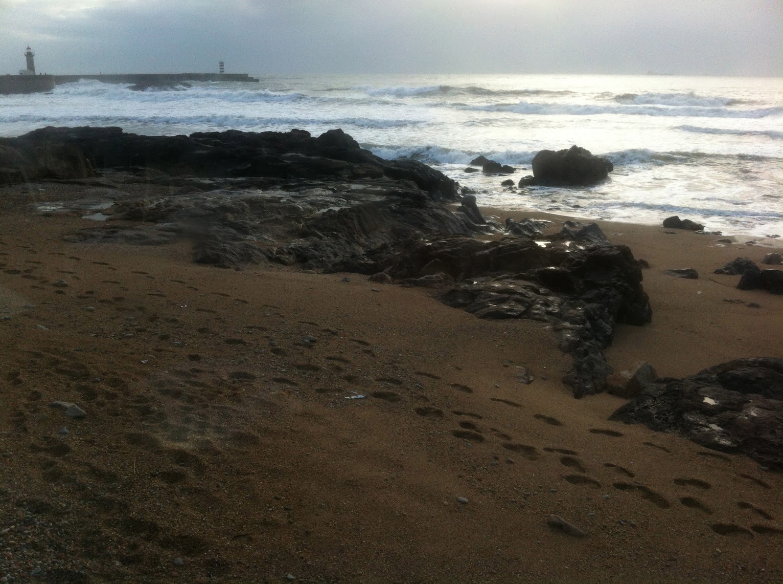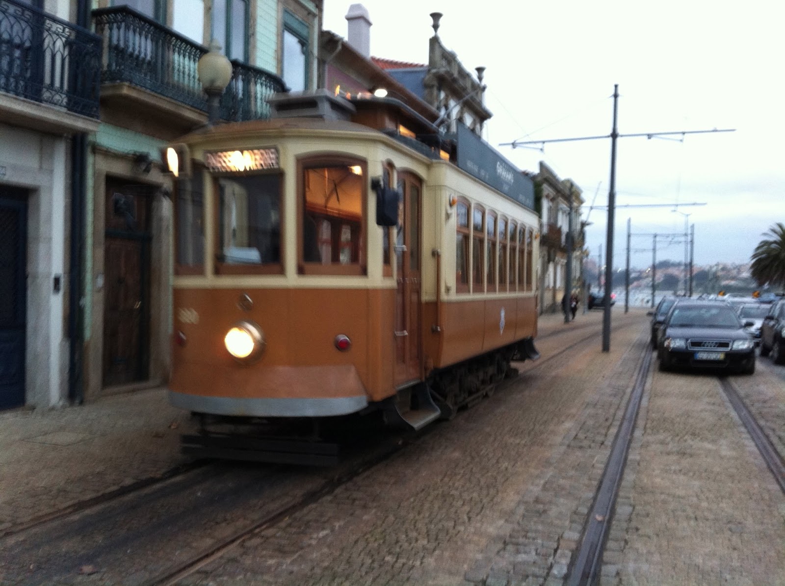 The Ribeira is the classic bit of river frontage in Porto with tiny shops and restaurants filling the arches of an ancient stone jetty. Schooners and sailboats were tied up along the modern key-side and tourists drank beer and looked up at the soaring spans of the bridge over the gorge above. Its a grand spot and P and I decided to follow the Douro through the city towards the sea, three and a half miles away. We took the tram route and every so often a single wooden tramcar clanked past us looking a lot like the cable cars in San Fransisco. They’ve all been restored with lots of polished wood and brass.We kept vowing to turn around at the next tram stop but somehow never quite did and after ninety minutes or so we were watching huge waves pounding the breakwater where the river meets the sea. Having stuck by our breakfast pledge not to have lunch, we were famished, and providence directed us to what seemed to be the only cafe in the area, right on the beach, where we had a couple of beers and a white plateful of cheese and olives. We watched the surf as dusk fell and then ran for the last tram. As we rattled back into the centre of the city, the last traces of sunset drained from the sky and the pink, blue and yellow lights of Porto twinkled across the river becoming a soft glow settling over us.