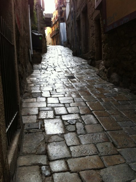 The buildings below the tower spill untidily down the slope of the city, along narrow streets which curl like thrown string. In places they are little more than alleyways and the buildings seemed to narrow over our heads, leaving just a slit of sky above, creating a gloomy twilight. On one street we stopped for what the Portuguese call a “Pingo” – an espresso with a shot of milk. Outside the heavens opened briefly leaving the cobbles with a gleam like polished pewter.