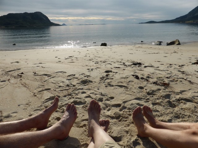 We could have stayed in this neat little campsite for days but there are so many more things to see so we pulled back out onto highway 17 – the Kystriksveien coastal route – which hugs the shoreline for almost seven hundred kilometers. My vocabulary for magnificent mountain splendour is beginning to run low, suffice to say that there was a lot of it. T didn’t see a great deal as he was practicing a maths exam in the back. Yes, we really are that mean. When his brain was full though we stopped at a little beach for a cuppa and a chance to wiggle our toes in the sand. I could have fallen asleep it was so warm and quiet. Tom paddled and Philippa brought us tea and melon slices.