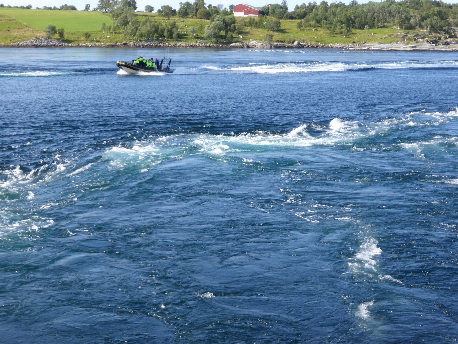 The turbulence is created because the tide has to move through a narrow channel which connects two fjords. Four hundred million tonnes of water rushes through an opening one hundred and fifty meters wide and creates whirlpools up to five meters deep and ten meters wide. I can’t say that they were as big as that when we saw them but no-one was anxious to go swimming.