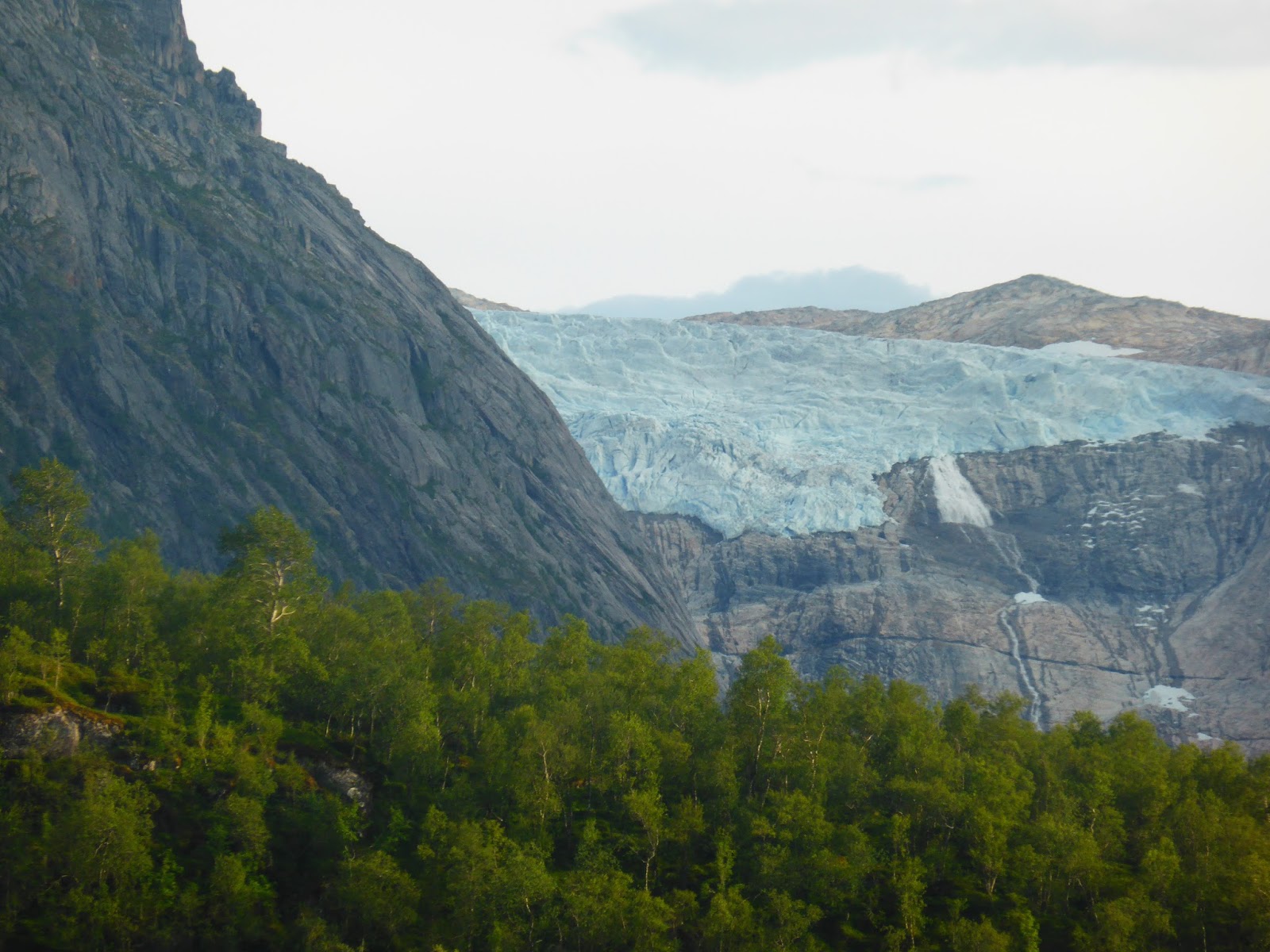 A little further on is the Holand information centre, and next to it, down a steep single track road is the small jetty from where the ferry goes across the fjord to the glacier. The small parking lot is virtually empty and looks over the water to the frozen blue icefield beyond. Its so pretty and quiet that we have decided to stay here for the night and catch the ferry tomorrow.