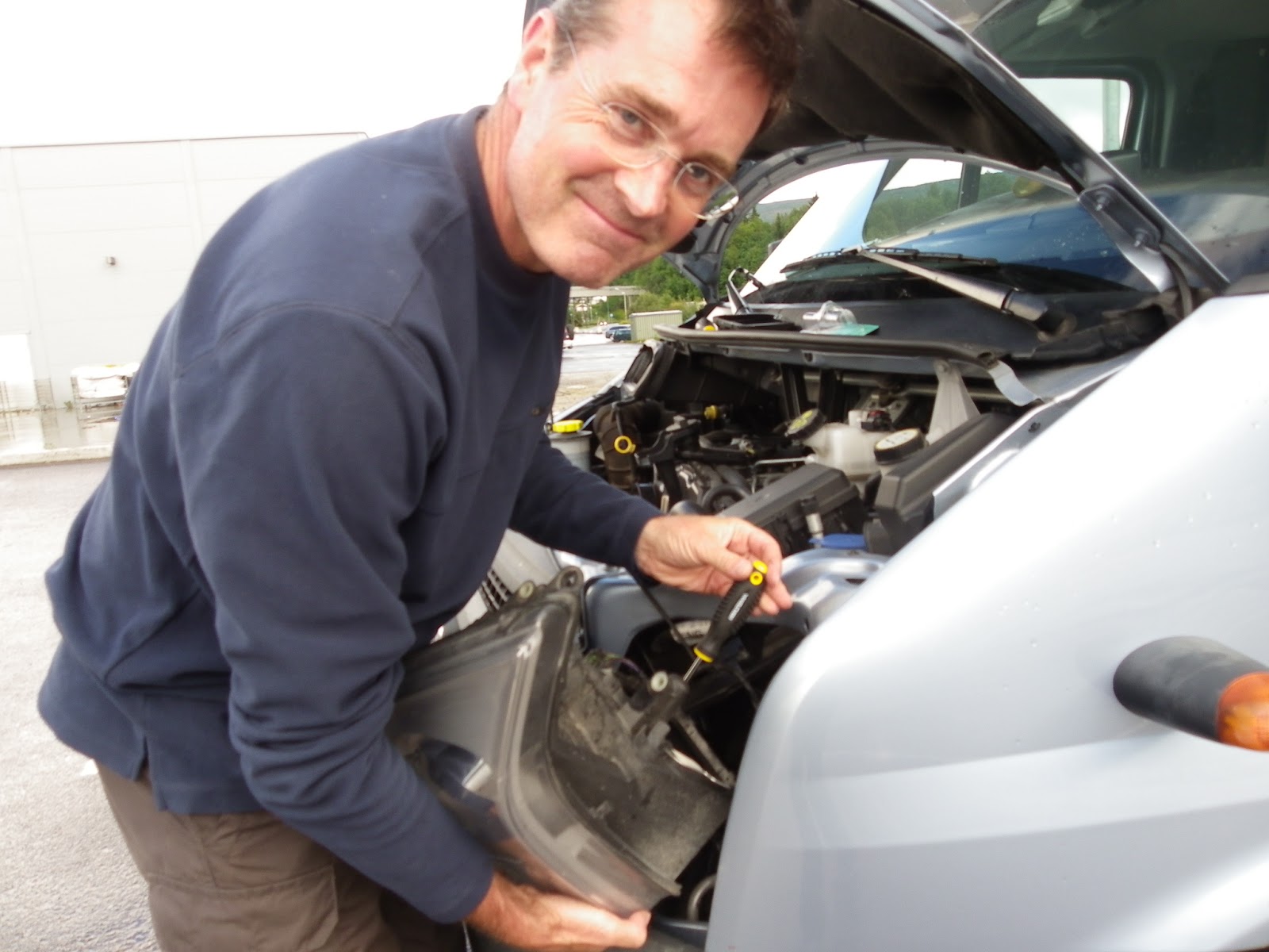 In the car park afterwards I checked Thor’s headlights, having had a couple of people flash theirs at me in the past couple of days. Sure enough, one of them had died and although I could see how to change it, I didn’t have the tools to do it. Back down the slippery hill and on towards Mo-i-Rana again. We pulled into an industrial estate full of car dealerships and garages, all of which were closed, it being late Saturday afternoon. Amazingly though, the one place that was open was a huge car parts place. So I bought two screwdrivers, took the old bulb out and got a new one just before the place closed. We continued the rest of the journey in full compliance with Norwegian law about running lights. Phew.