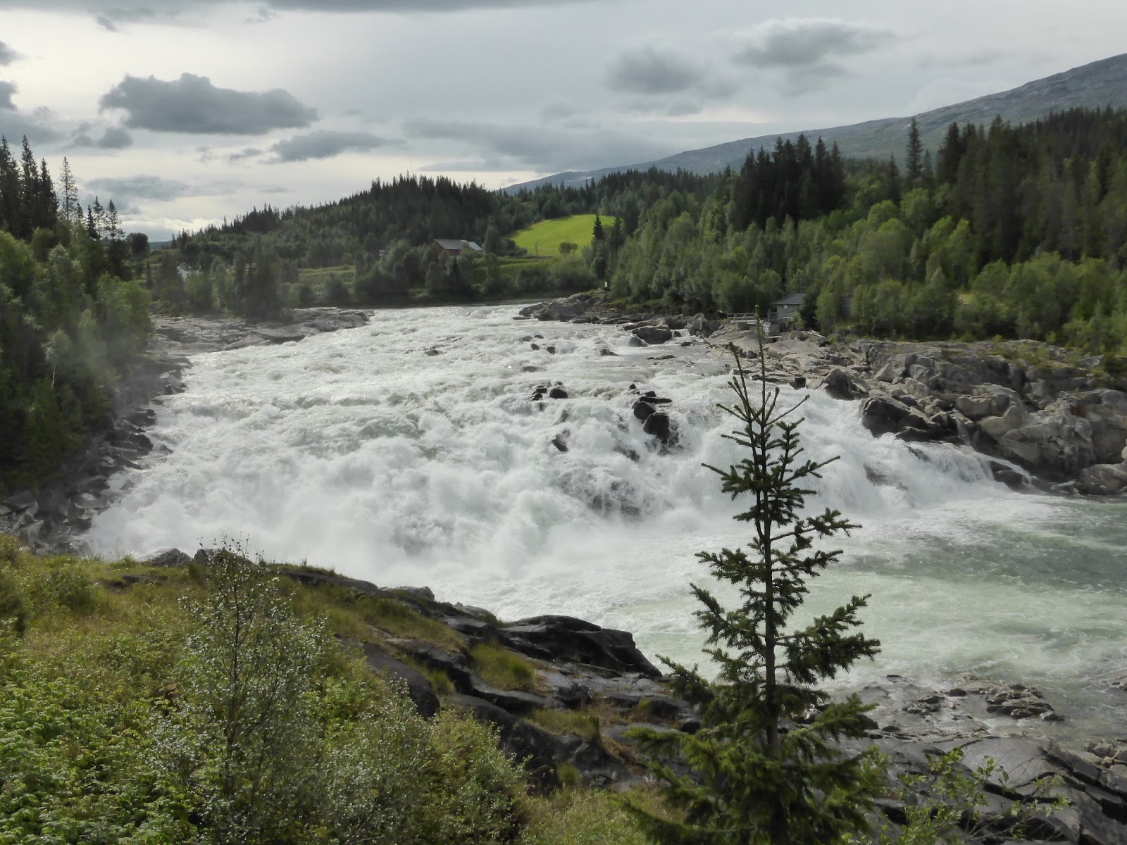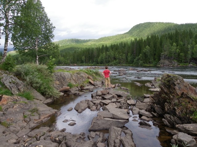There are scattered settlements along the route, some with great names. I particularly liked Grong and Kvam, which looked like the words printed in a Batman comic during a fight. We had lunch by a river somewhere, where T and I ran over the rocks as P made soup – he only got one foot wet…
