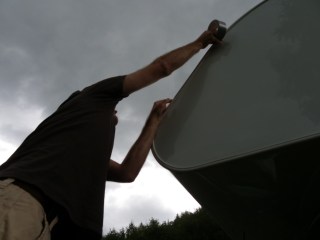 Well the good burghers of Mosjean didn’t mind us camping in the Town Hall car park but it turned out that the town was hosting a fly fishing competion and at half past midnight, after an hour or so of lying in bed listening to trucks pass and various rowdy fishermen staggering too and from the bars, we decided you can have too much of a free thing, and moved on. We drove for ten minutes back up the road under a violet sky to a picnic area we had noticed on the way into town. It was completely empty and we parked. Tom roused briefly and went back to sleep. Ironically, a building at the end of the parking area had some kind of function on and the bass of the music was boom booming our way – but distantly – and soon P and I were also asleep.
