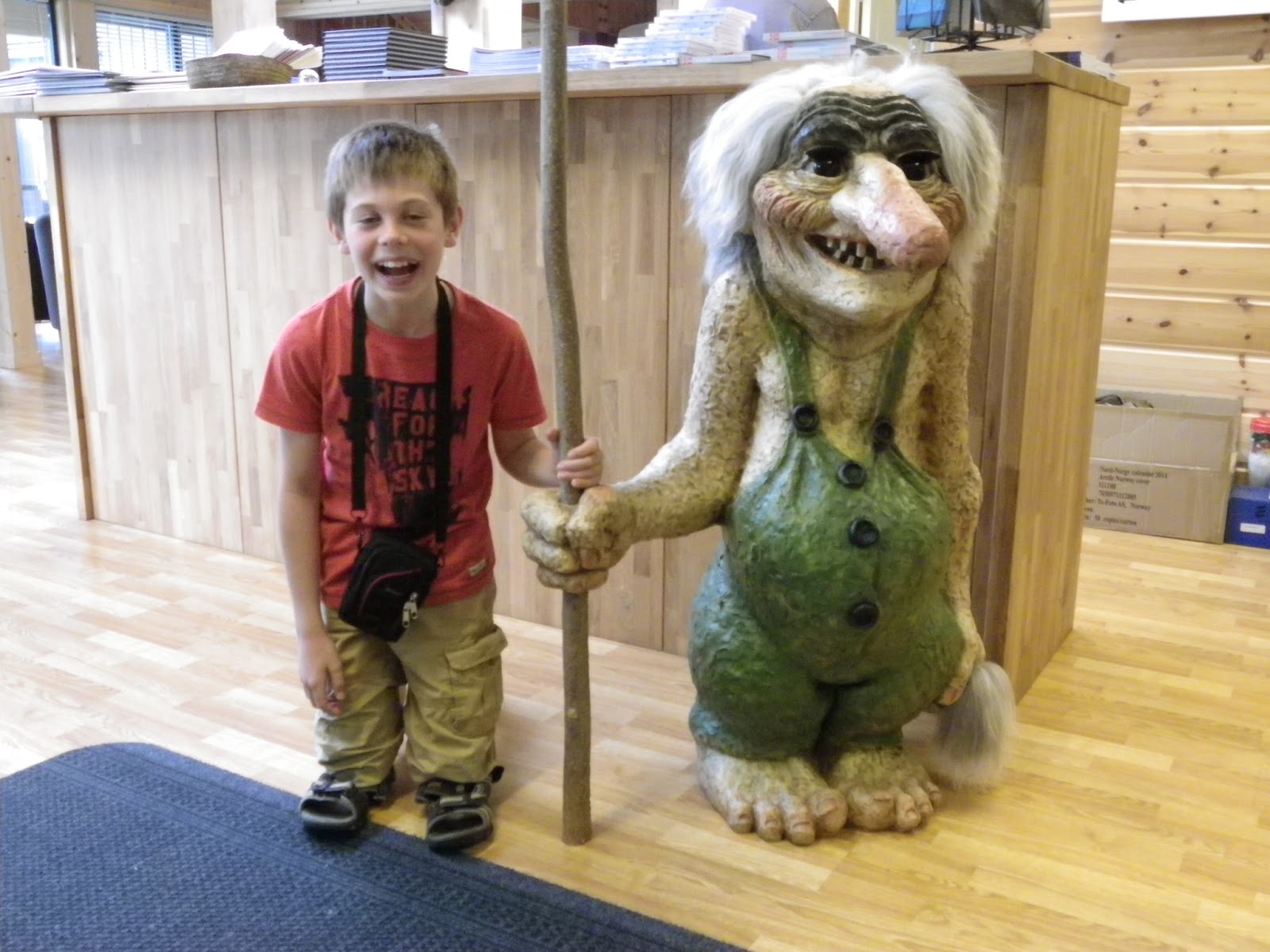 We pulled in for coffee at one of Helgeland’s top 8 – the Laksforsen Falls, a “17 meter high waterfall” Its actually more like a long series of rapids and perfectly pleasant but not nearly as spectacular as the unmarked one on the road to Jokkmokk. The strange thing was it had been sort of bought up by the cafe, such that you really couldn’t see the falls apart from on one of their balconies, and they charged for going onto the one closest to the water. They charged for using the toilet too. Thankfully we had brought our own. Anyway the coffee and waffle were nice, as was the owner and there was no charge for posing for photos with the trolls.