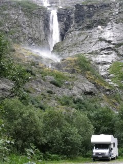 After much plotting over the map last night, we decided to take the route less travelled. It would have been easy to continue on the better known road south from Geiranger to the two famous overlooks (including the pointy one that Tom wants to sit on suspended thousands of feet above the water), but that felt a little too much like heading towards journey’s end. We still have more than a week and so we opted to take the ferry down Geirangerfjord to Hellesylt at the end and peel off towards the western arm of the Jostedalsbreen glacier.