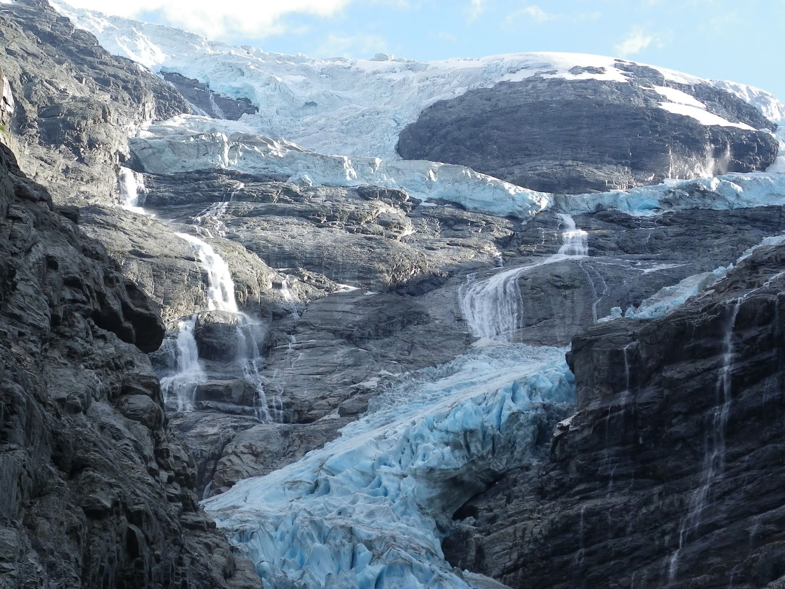 You must pay 50 Krona to proceed further along the road, but it is well worth it, for it leads to a parking area surrounded on all sides by steep rock walls with gushing white waterfalls. At the head of the valley, the glacier looms threateningly, sending a thick finger of blue-grey ice down the rock face. This is the Kjenndalsbreen glacier arm. Waterfalls pour from it and over it, ending up in a furious milky river which is roaring off through the valley.