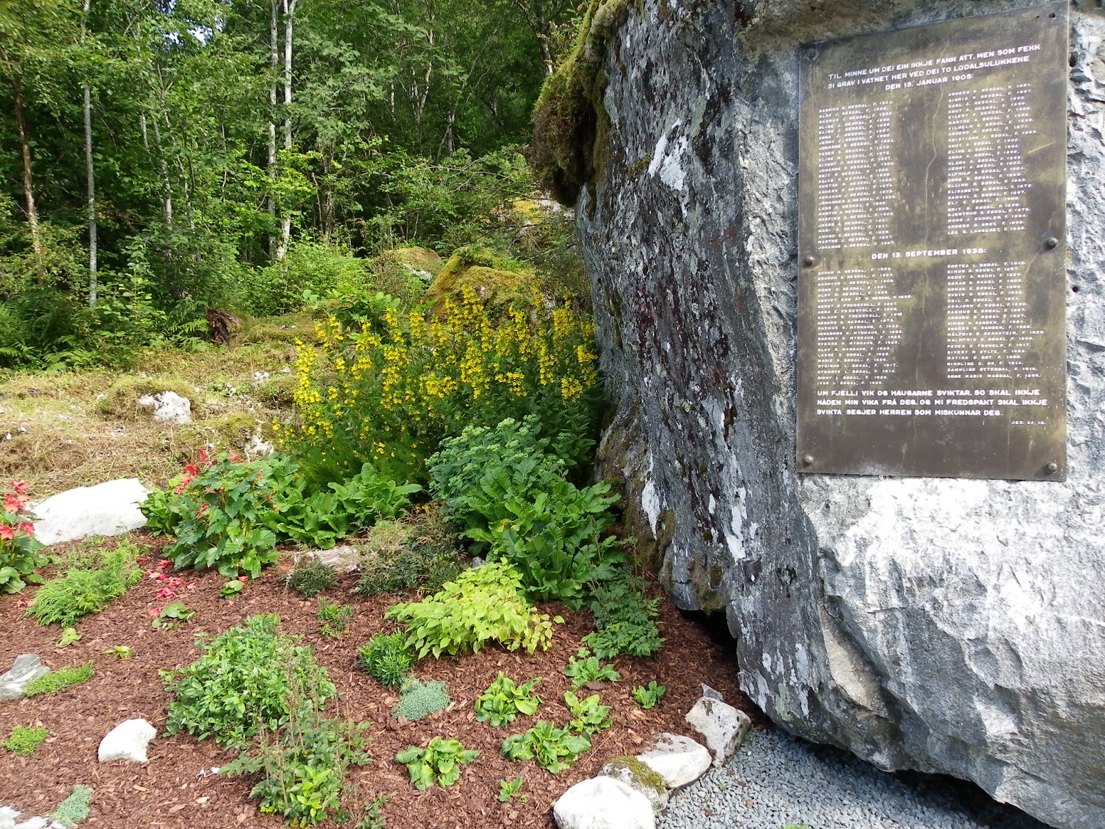An immaculate memorial garden records the names of those who lost their lives. Only a handful of people live along the lakeside now, though the area below the mountain is now so full of rock that another landslide would be unlikely to produce another tidal wave.