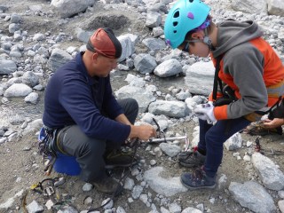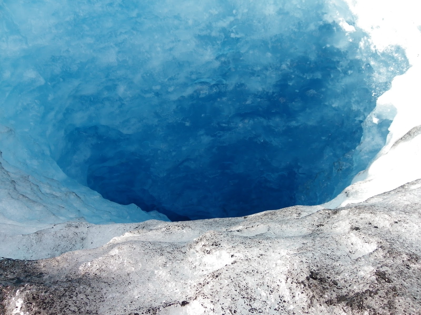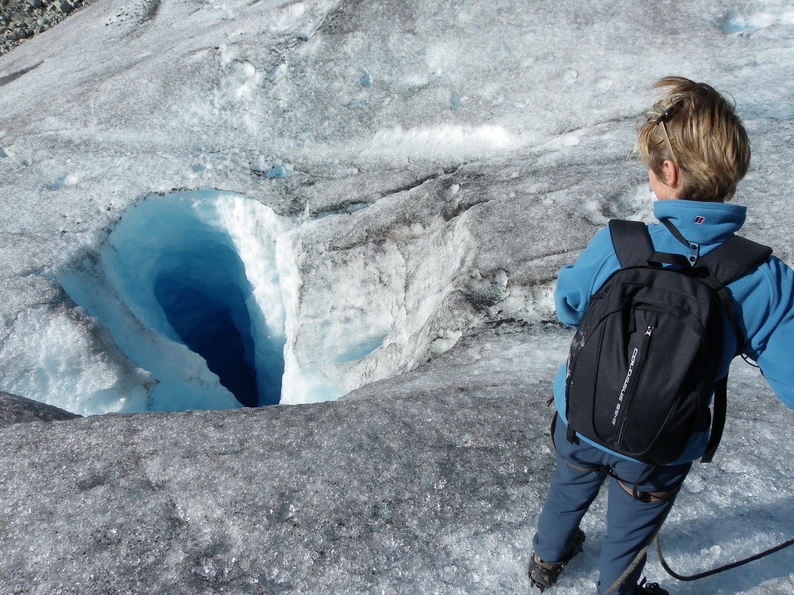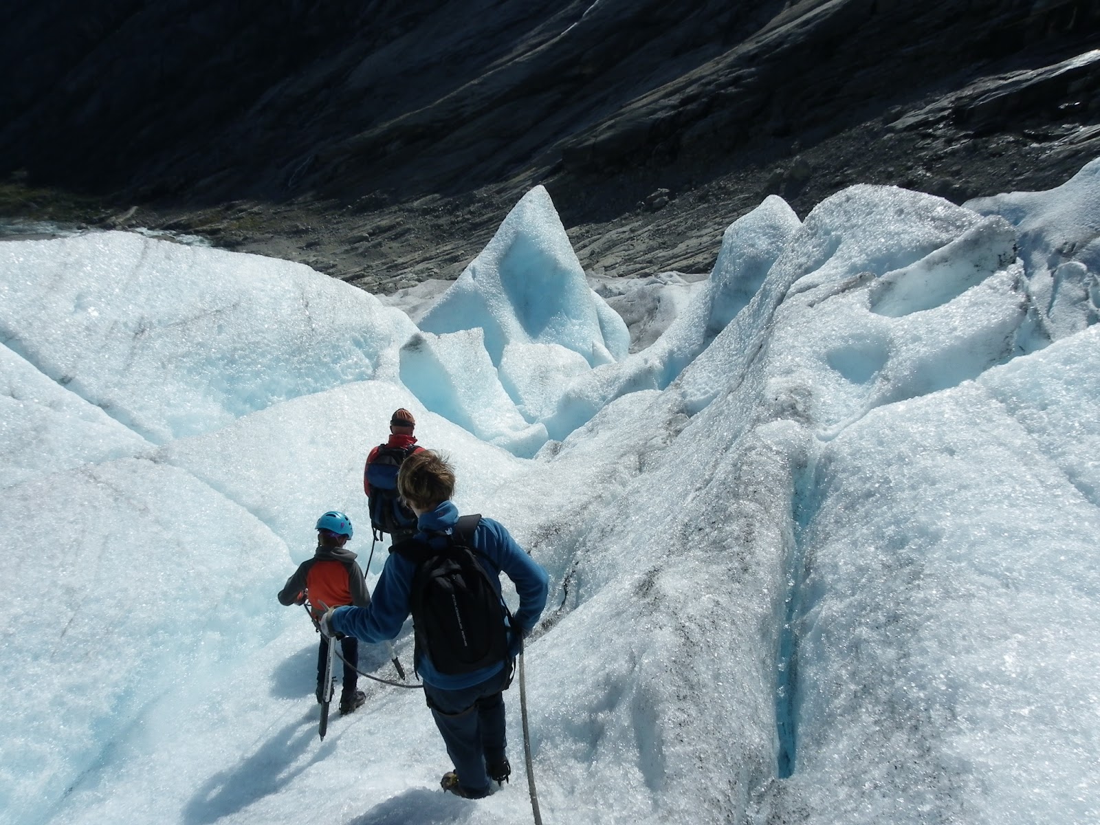 Walking on a glacier is such an alien experience. Lower down it is as though it is composed of millions of ice cubes, each about the size of Tom’s fist. It crunches and crackles underfoot as if you were walking on broken glass – or big diamonds.