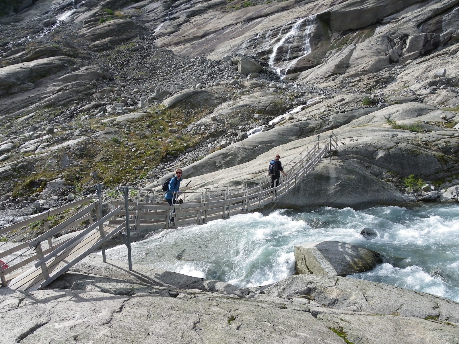 It was completely thrilling just to take a few steps. The whole glacier is a mass of tunnels and rivulets and streams and rivers running over, through and under it. You never really lose sight of running water somewhere over its surface, and of course all around on the slopes of the mountain there are huge waterfalls created by the vast Jostedalsbreen glacier above the relatively small offshoot we were walking on.