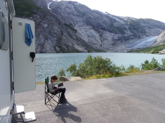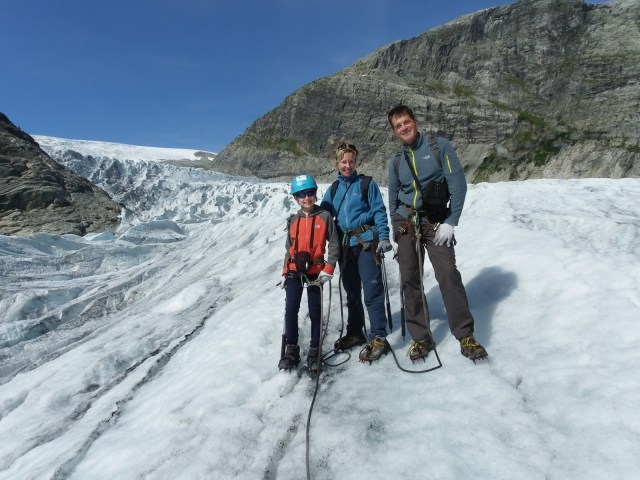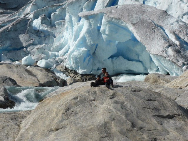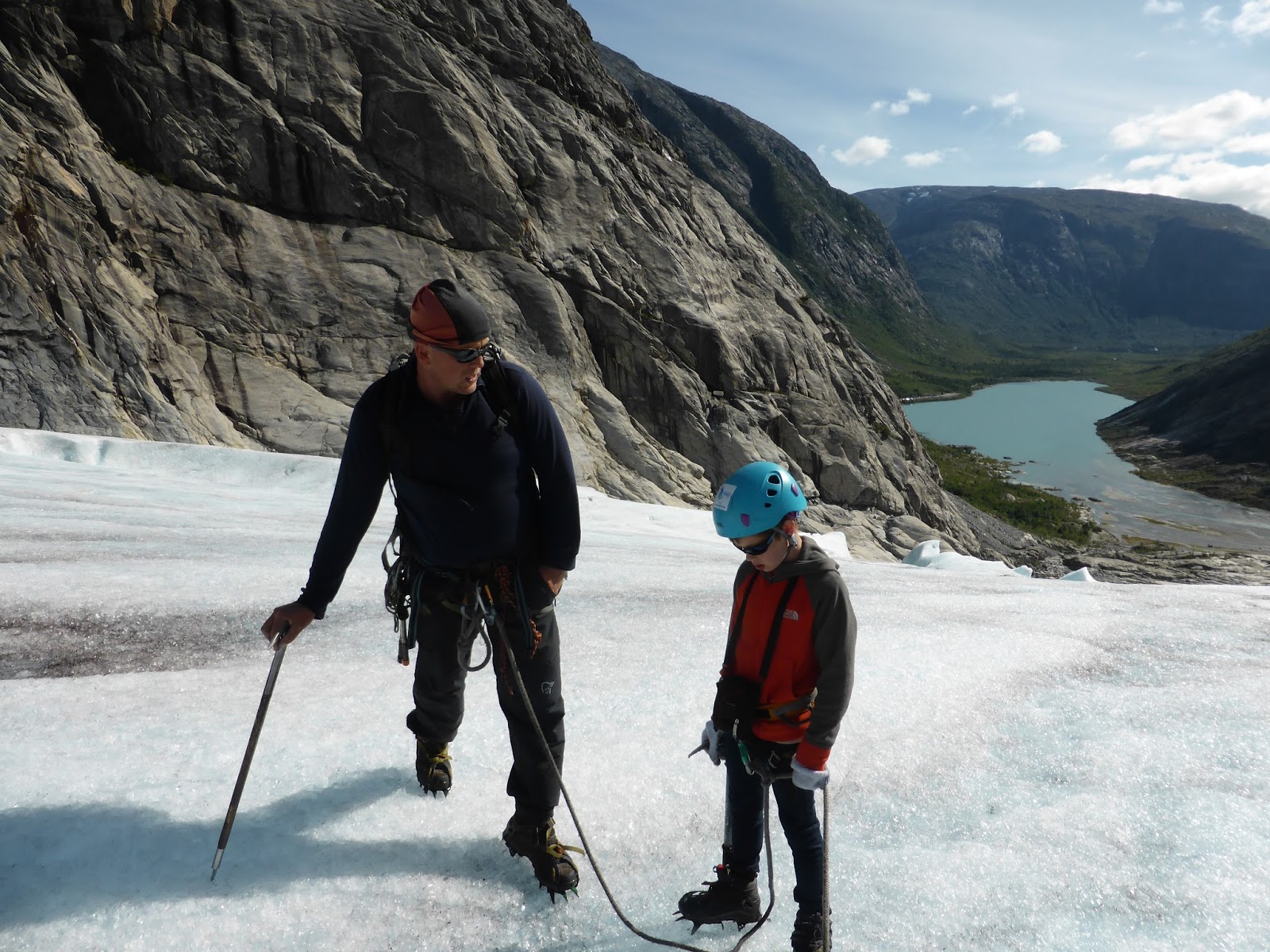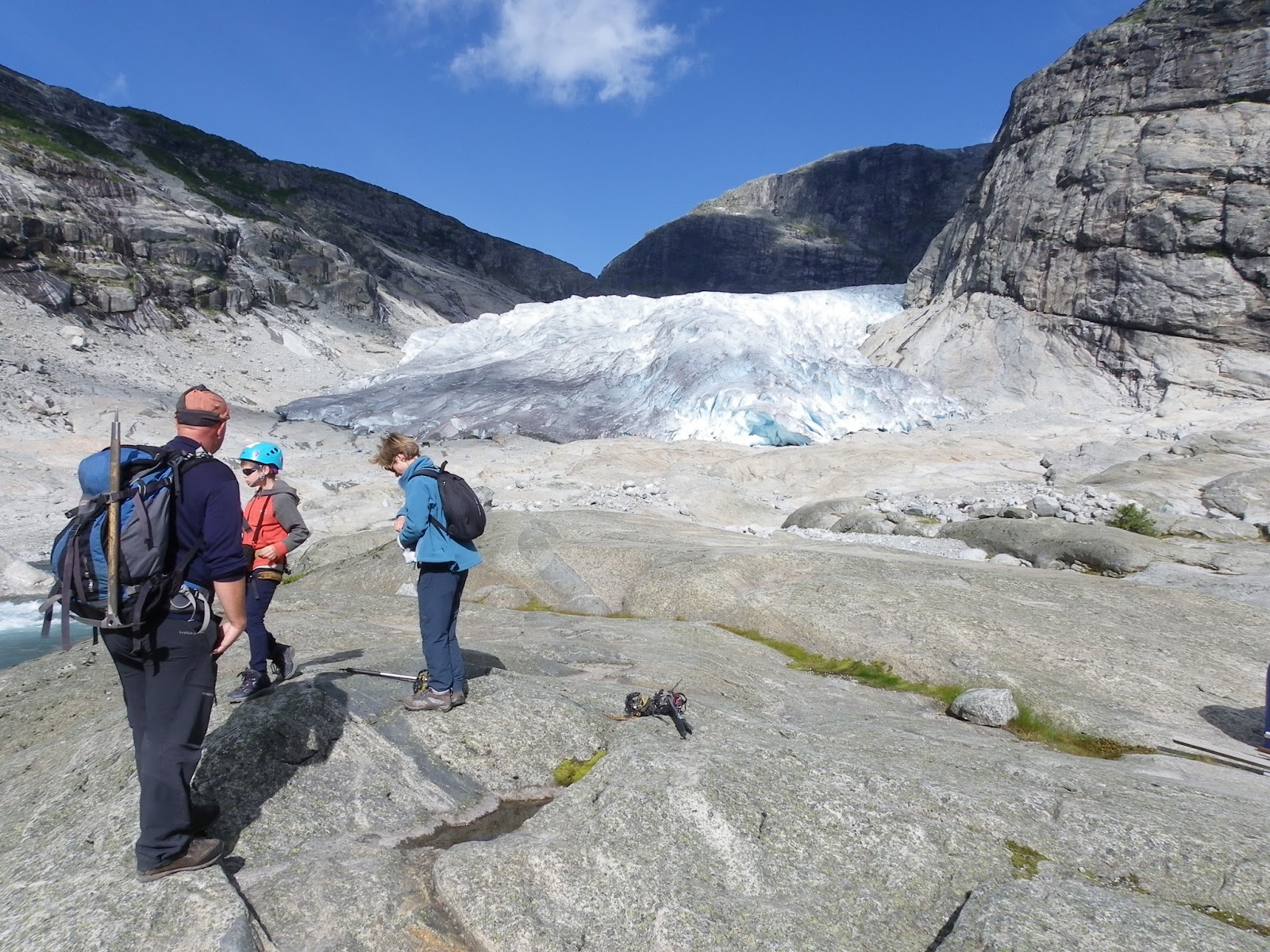 It rained on and off for much of the night but this morning the clouds were being whittled away by sunshine and the sky was soon completely blue. So the Glacier walk was on! I rang the glacier centre a couple of days ago and found that they had now stopped the group tours in which ten year olds are allowed to go, but if we had a private guide we could all get onto the ice. So, on the basis that this is not something you do every day, we coughed up for the private guide and met him by the lakeside just across from the Nigardsbreen “Nodule”. Our guide book insists that these rivers of ice that curl down the hillside from the Jostedalsbreen glacier above are called “nodules” but its the least convincing name for them imaginable and I haven’t seen the term anywhere else so I’m going to ignore that terminology.