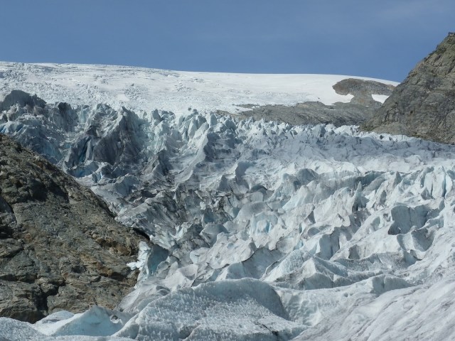We climbed out of the crevasses and onto the wide flank of the glacier, looking down onto the lake below, and up onto the ferocious ice cliffs in a narrowing of the valley above us. Frånk said it would be possible to walk through them but would take days.