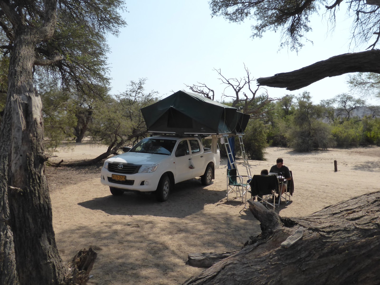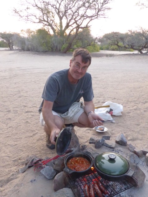We are so dusty. Our fingers are ingrained with it, our hair is dry and matted, our clothes leave small clouds in our wake as we walk. We are Pig Pen in “Peanuts”. Everything in the back of the truck is coated in white, red and grey dust, including our holdalls which thankfully do a pretty good job of keeping the dust out. We are not sure whether the water at the Puros community campsite is drinkable so we are using the ten gallon barrel we filled at Kunene. Everything takes thought. We have a limited supply of firewood and it takes at least half an hour for the fire to be ready to cook on.The sun goes down and it gets dark around 6.15. which then makes cooking more complicated. The fridge (yes, the fridge!) runs off a battery which needs about fifteen minutes of driving time to charge. There aren’t necessarily food shops… Its interesting to have your life governed in this way when we are so used to everything available all the time. Its strangely liberating too because you are forced to only think about the essentials and can ignore all the other clutter of a western life.