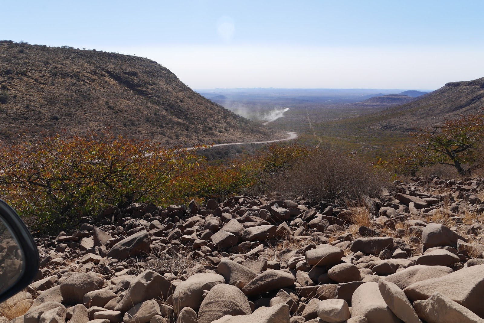 Soon we were creeping down the steep 4×4 track and heading towards Twyfelfontein. There was one more foot-and-mouth roadblock to pass through where the guy in charge sold Philippa a pretty wooden necklace made (we assumed) by the family camped behind the road-block. He noticed that we had a soft rear tyre and it struck me that I hadn’t checked them this morning so couldn’t be sure how bad the situation was.