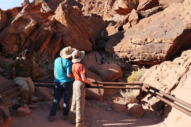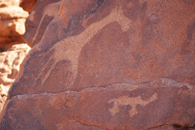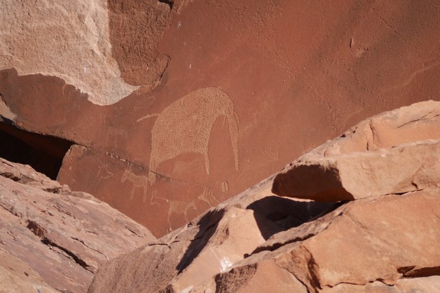 I have to say that all of this strikes me as guesswork given that no-one even knows exactly which people were living in the area before about 1940. Even when the Damara who’d moved in were cleared so that the land could be given to white settlers there was no-one around who understood what the engravings really meant (according to the guide anyway). They were lovely though. A beautifully rounded elephant and spiky nosed rhino and – extraordinarily – a couple of seals. That suggested that the Bushmen were used to going to the coast to trade. It was well worth the trip despite the annoying staff.