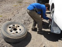 We have two spare wheels with tyres and another spare tyre so we fished one out, jacked up the truck and popped the new wheel on. We were off again without too much of a problem. We were fairly sure we would get a puncture at some stage given the roads we’ve been driving for the past couple of weeks and I was glad it was on a flat gravel road rather than one of the tight, steep, rocky/sandy tracks we’d been driving on in Kaokoland.