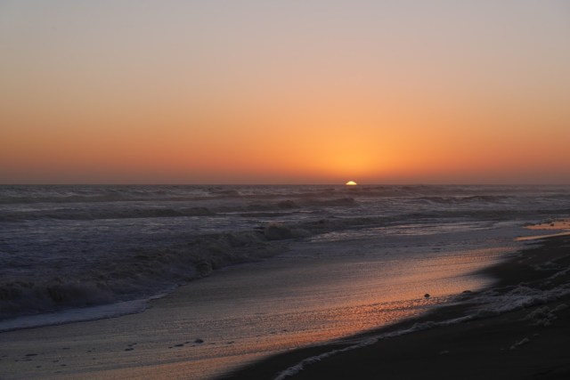 The fish was fresh and huge, the beer cold, the waitress jolly. We couldn’t linger though, it was now five and we had an hour left to drive on unlit salt-pan roads in the last of the daylight. Just a few K down the road though we saw a large ship rolling in the surf and pulled off again for a look. It was another fishing boat that ran aground in 2008. We watched it tossed around by the surf as the sun went down.